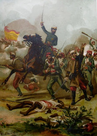 | El general Joan Prim homenatjat com a heroi de la batalla de los Castillejos (Ceuta), al capdavant dels seus voluntaris catalans |